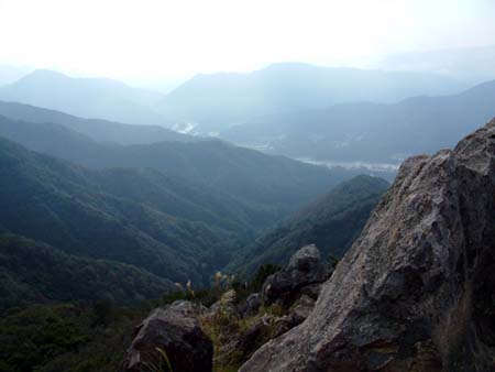 福島方向の眺め。頂上は岩がむき出しになっている。
