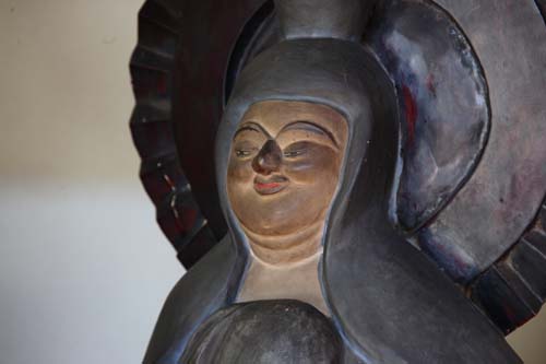 柏崎市鳥越地区の集会所内にある大日堂に安置されている木喰仏二体。文化元年(1804年)に鳥越に訪れたときに寝泊りをした行屋で彫ったとされる。どちらも後から手が加えられて彩色されてしまったようだが、像の裏には木喰さんの墨書が残っている。中越沖地震の際に落下した傷が残っている。